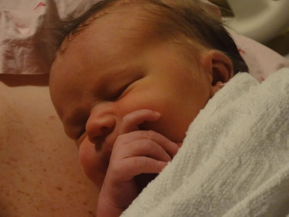Here is how we teach this; baby is born, comes right up to mom after the cord is done pulsing, and is dried on mom’s chest (or another parent’s if mom is not able). Once baby has gotten settled, we take a corner fold and wrap the baby and mom together so that everyone is covered, with the wings of the blanket tucked under each of mama’s arms, and the bottom tucked underneath baby.